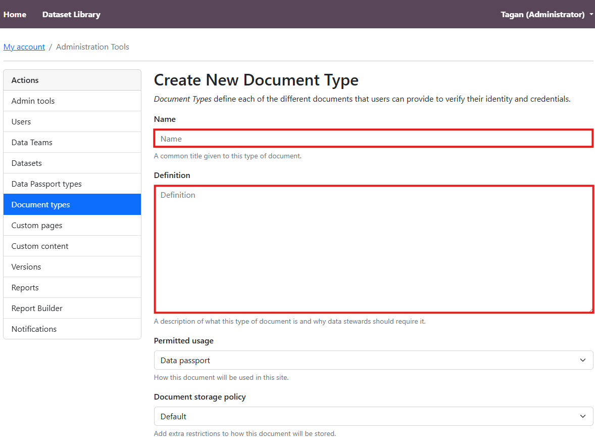 Administrators can create document types in order to represent a specific category or classification of documents that users can select and submit when making a data request.