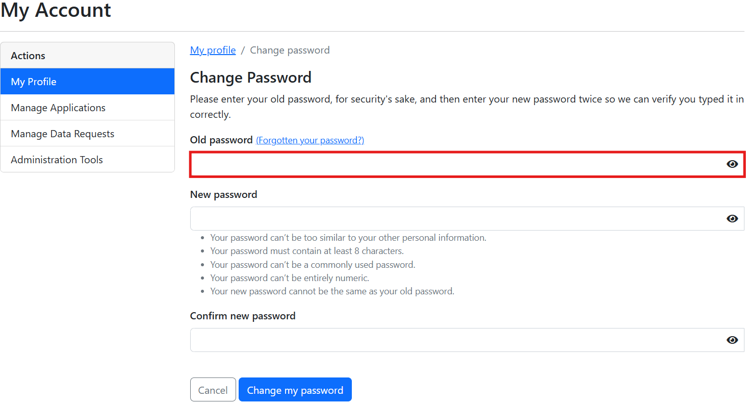 3. Populate the 'Old password' field with your current password.