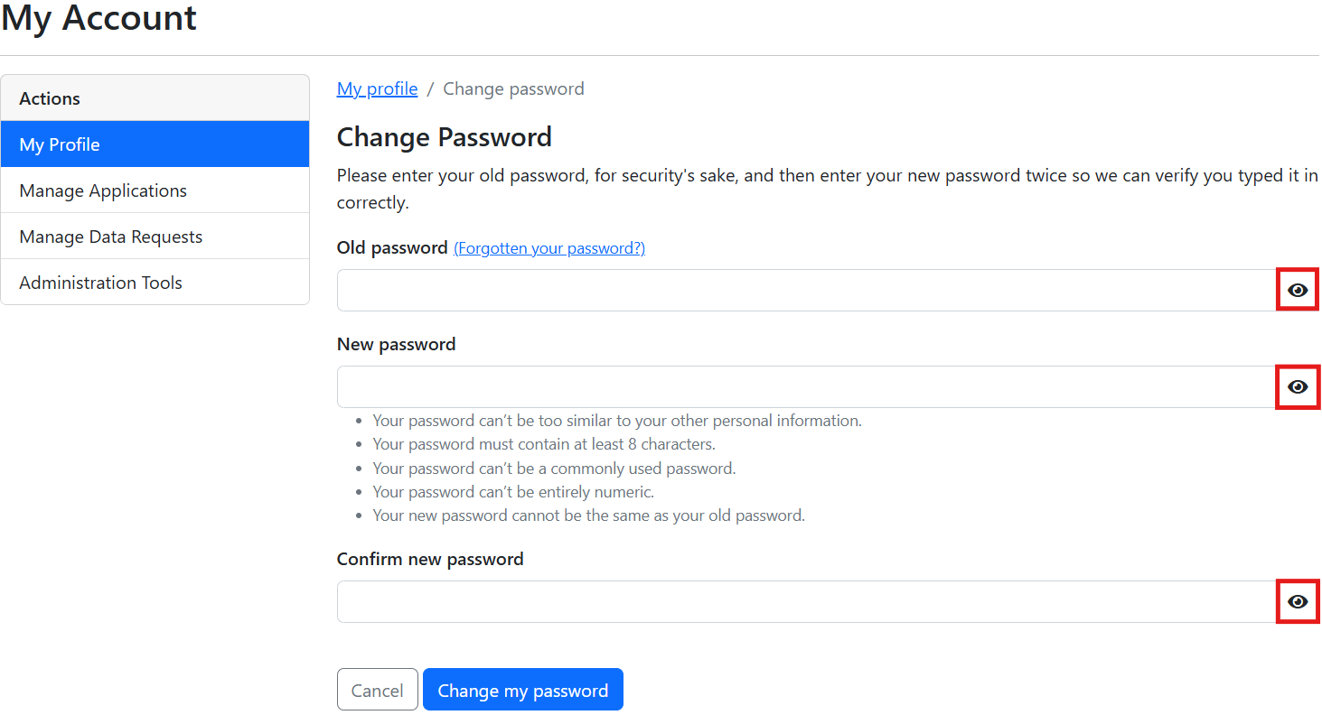 **Note:** Select any of the eye icons (below) to toggle password visibility for all fields of the 'Change Password' page.