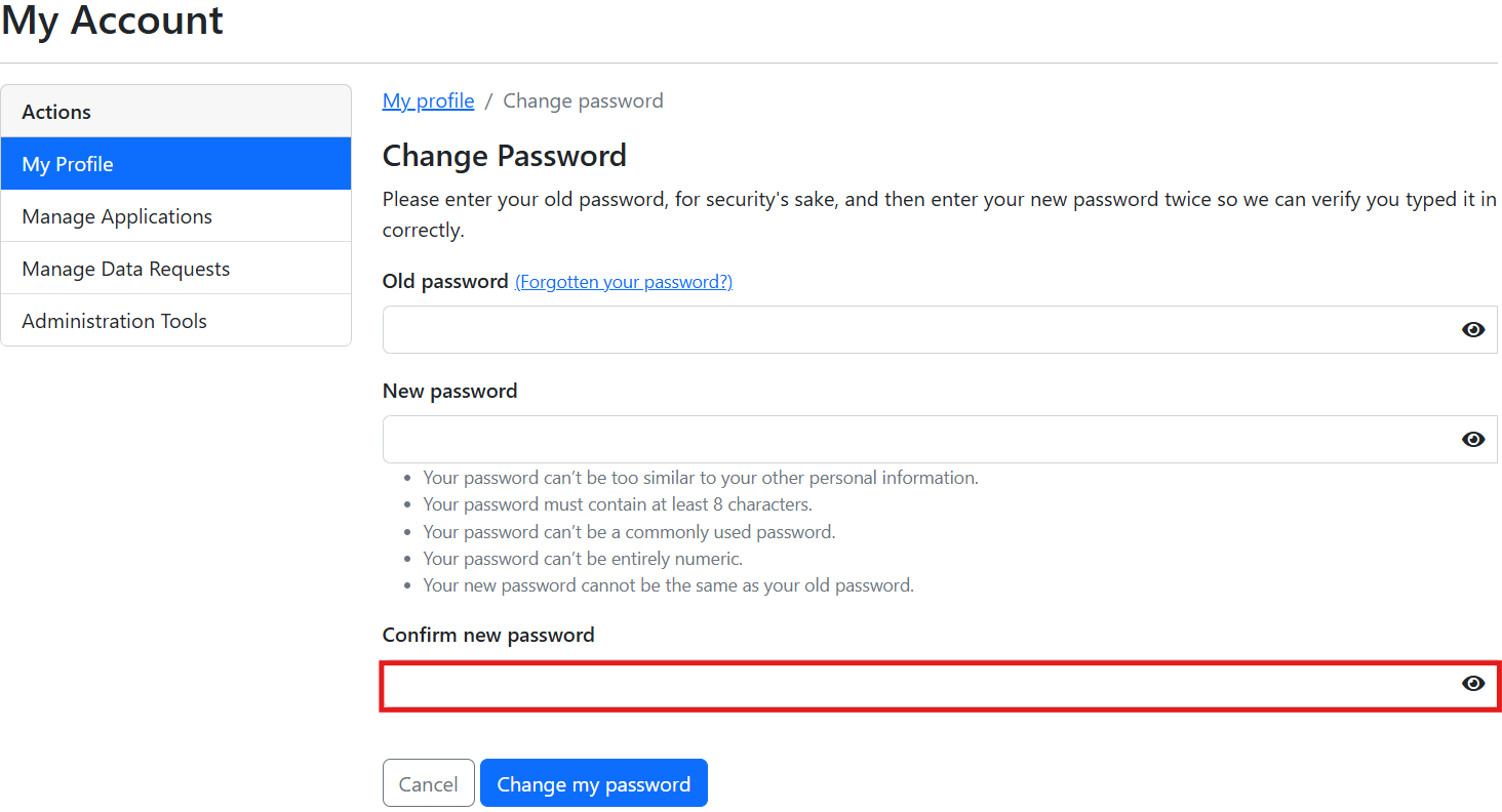 5. Populate the 'Confirm new password' field with the same password you entered into the 'New password' field, ensuring they match exactly.